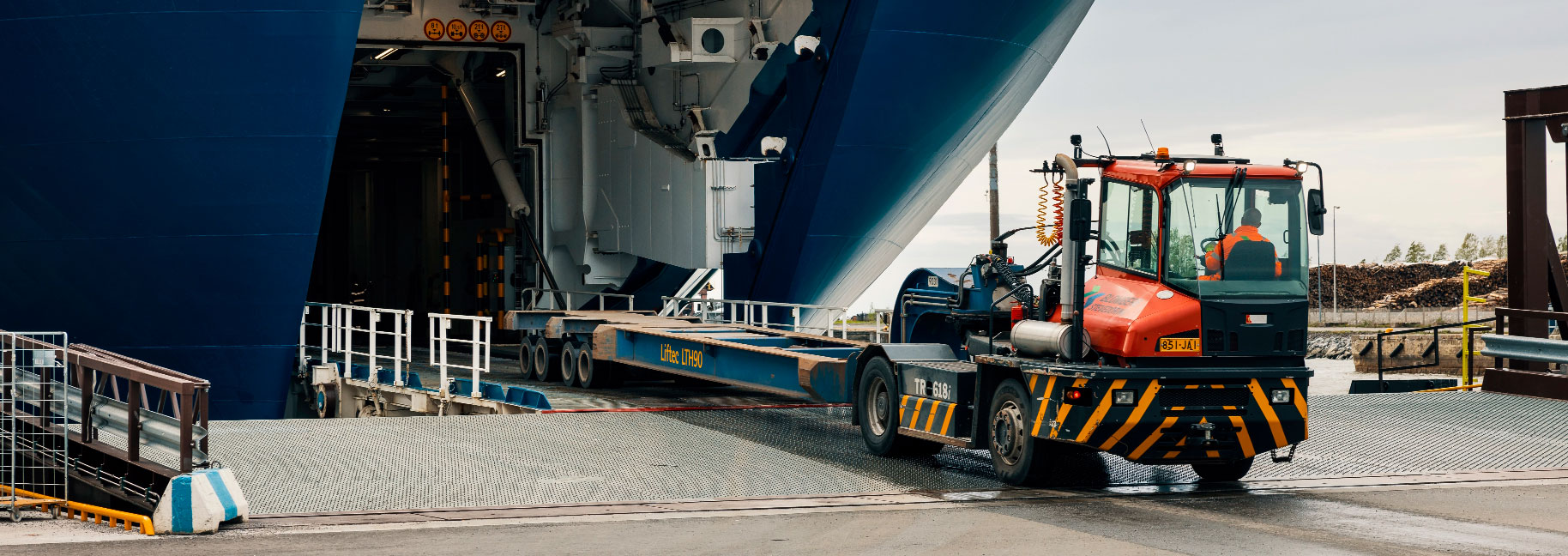 RoRo ships are designed for cargo that can be driven on and off, such as passenger vehicles and construction equipment. Products like concrete elements are placed on cassettes with wheels and then rolled on and of the vessel using terminal tractors with lift-trailers. Blomberg Stevedoring has, among other things, Finland’s largest terminal tractor, which makes RoRo cargo suitable for almost any type of cargo.